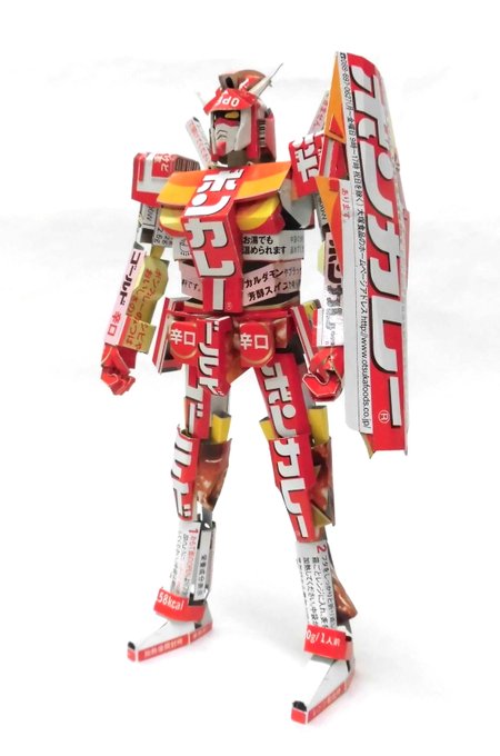 「ボンカレーガンダム<大辛バージョン>」(2021) ビームサーベルはカレーのパウチの端を切ったものを使ってます。 #大塚食品 #ボンカレー #ガンダム #空き箱 #空き箱アート #パッケージクラフト #ペーパークラフト #空き箱工作 #boncurry #gundam #packagecraft #papercraft