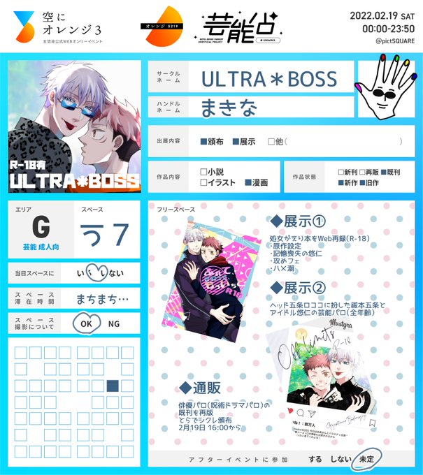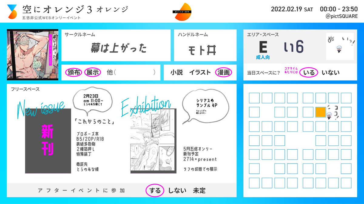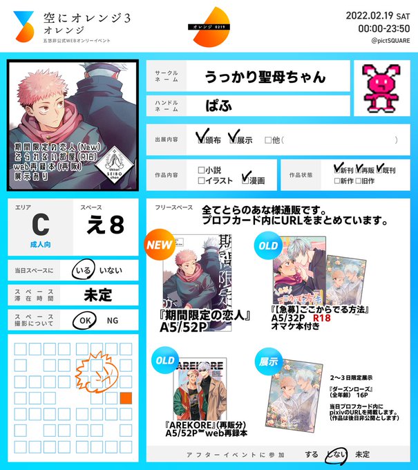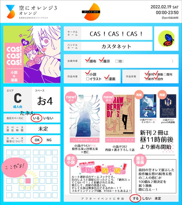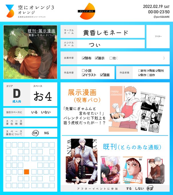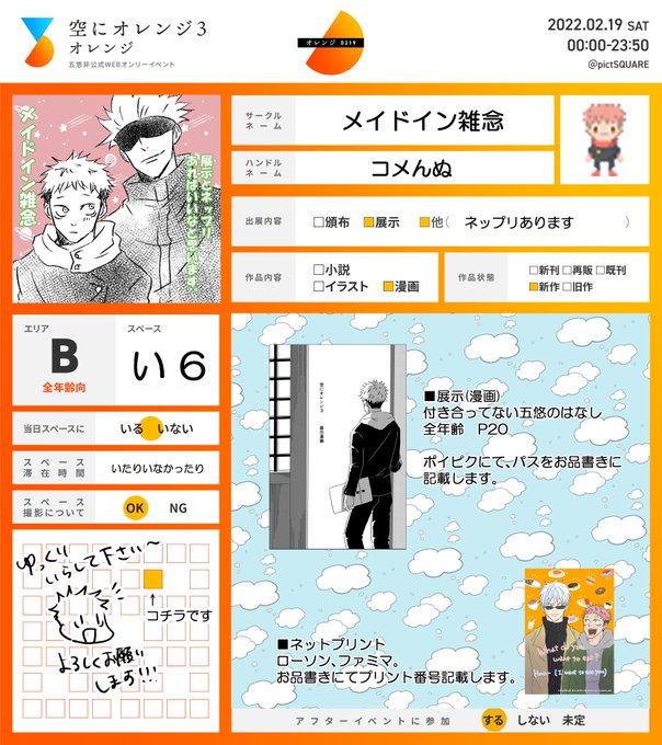 2/19 空にオレンジ3🍊お品書きです!楽しみだ〜〜〜!当日は五悠を求めてウロウロしています!!宜しくお願いします #空オレ_0219 #空オレ_0219_頒布 #空オレ_0219_展示 twitter.com/s5yu_/status/1…