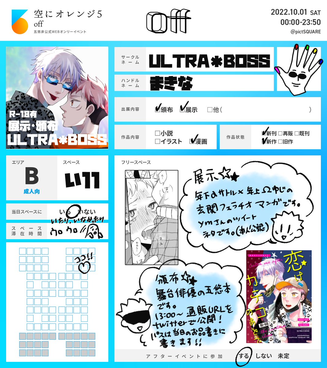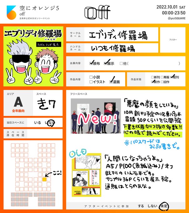 #空オレ_1001 #空オレ_1001_展示 10/1 off 空オレ E-お2 に配置されてます ・お品書き 新しい展示は、根付ゆじくんの漫画の予定です。 あとonに載せた新刊のサンプルなどもまた載せます。 ・既刊はとらのあな ec.toranoana.jp/joshi_r/ec/app…