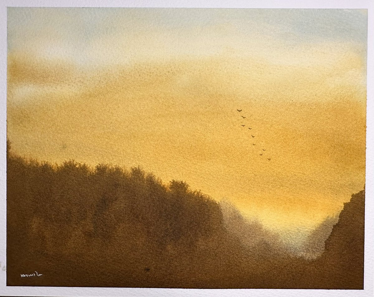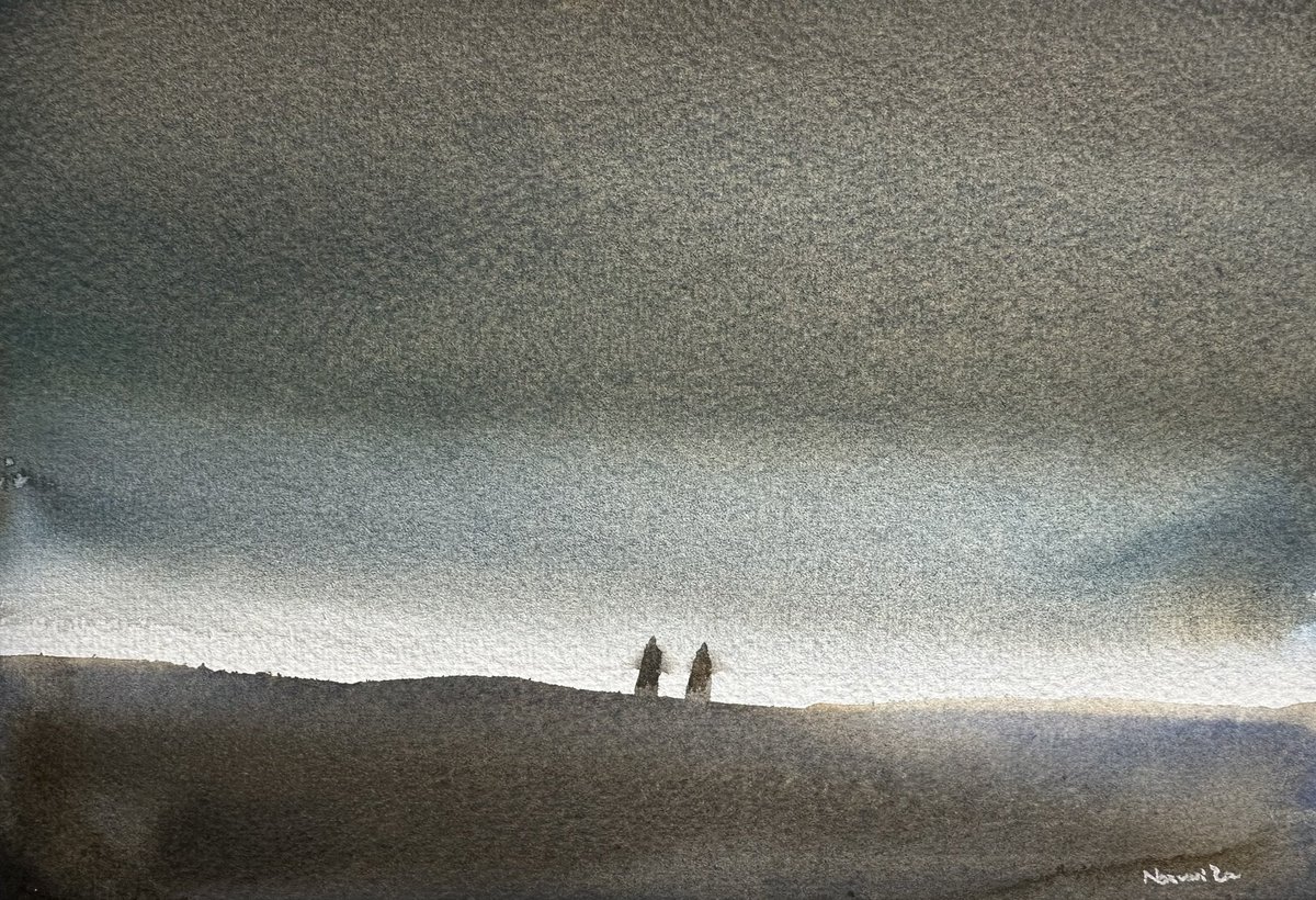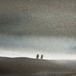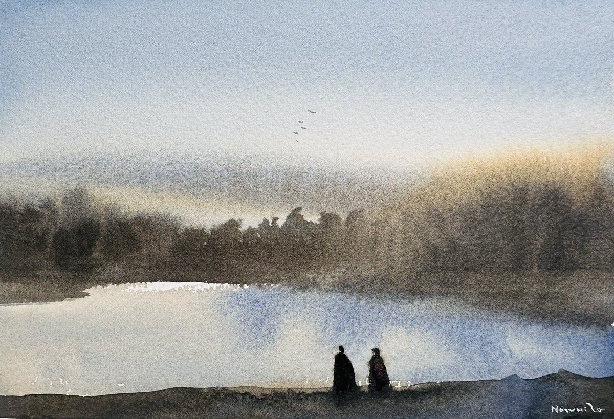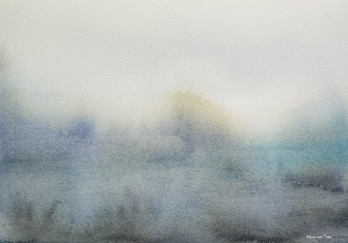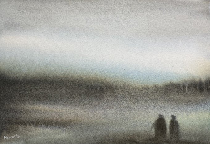 #ファンになってくれる人RT 違う時代の違う世界を旅する2人を描いてます。 絵は水彩画の「滲み」が生み出した偶然の模様を元に描きますので、描いてる僕も彼らの旅の理由を知りません😌🙏 #watercolor #水彩画 #透明水彩 #空想画 #旅の詩