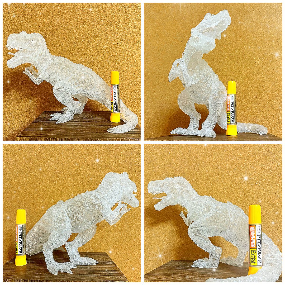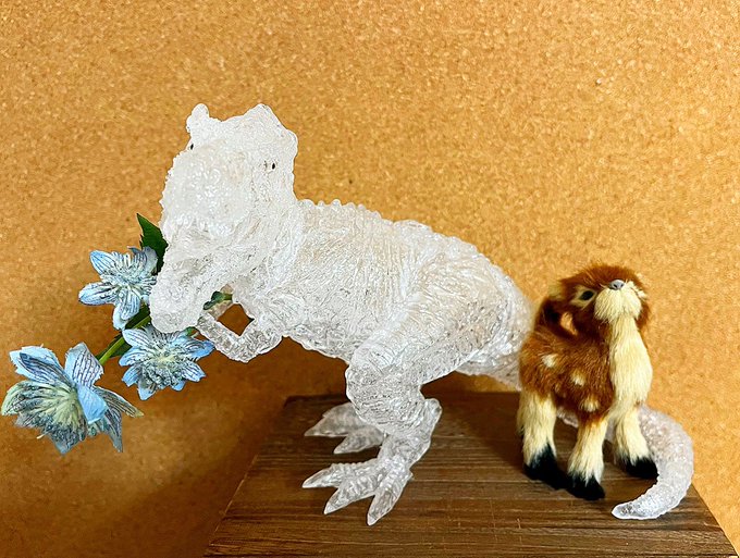 #ゴールデンウィークSNS展覧会2022 頭のてっぺんから 爪の先・尻尾の先まで 空洞で作った「ICE T.rex 🦖」 氷の造形のようなこの恐竜は 全長42cm・重さ70g! こんなに大きいのに 空っぽの牛乳パック2個分の重さです #空洞レジン じっくりと時間をかけてフリーハンドで描きあげています