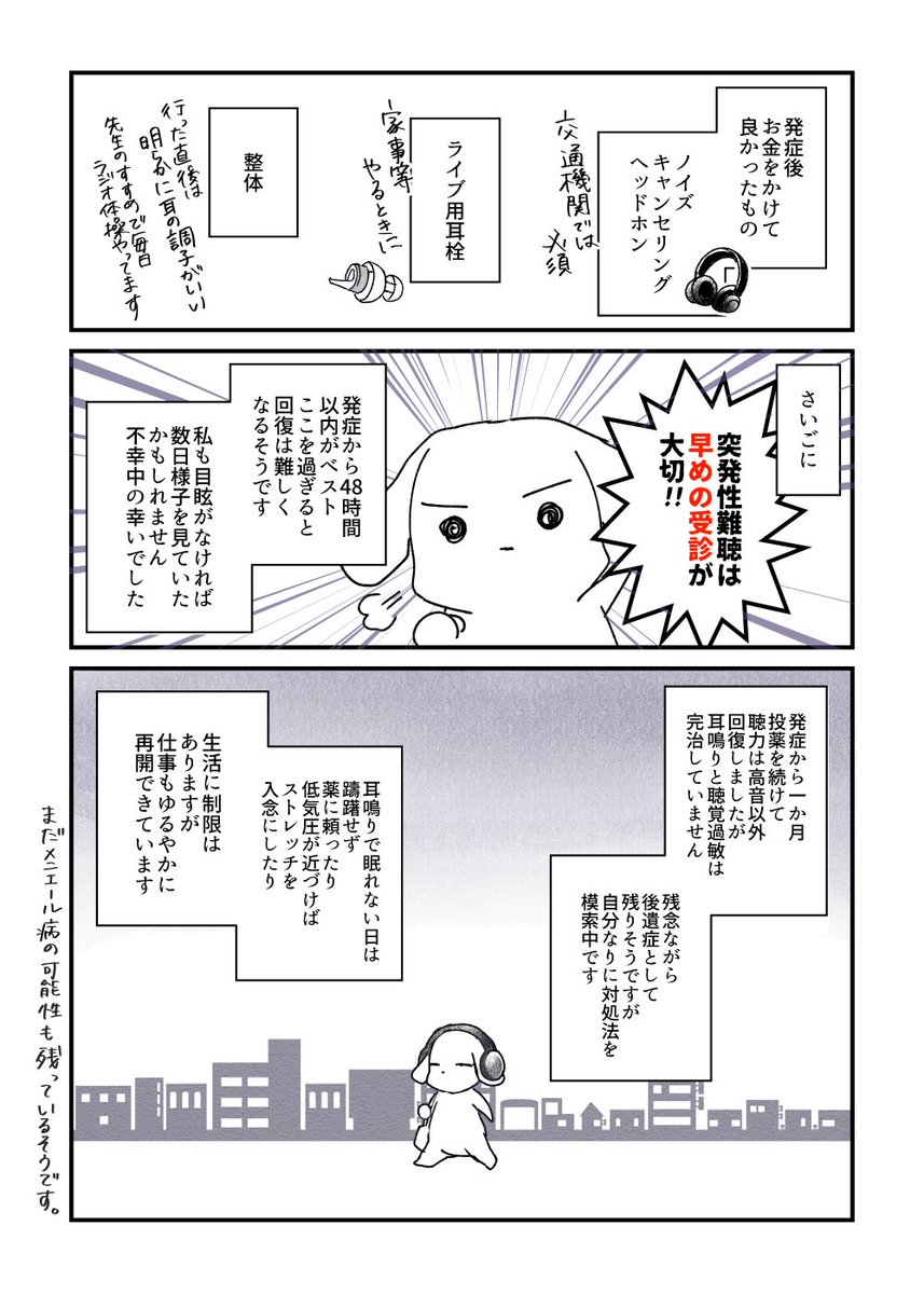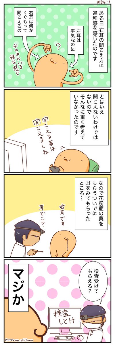 突然聞こえづらくなって、放置したら一生聞こえないで生活するハメになる恐ろしい病気だ! 1週間以内と書いたけど、48時間以内が理想的だ! みんなも耳が聞こえなくなったらすぐ病院だ!!! 今までの作品はこちらから→ameblo.jp/menon-blog/ #突発性難聴 #4コマ #漫画が読めるハッシュタグ
