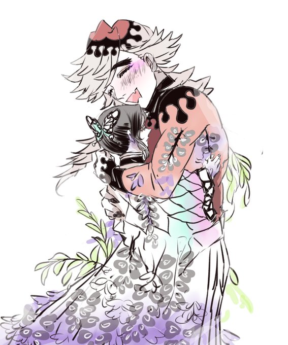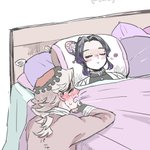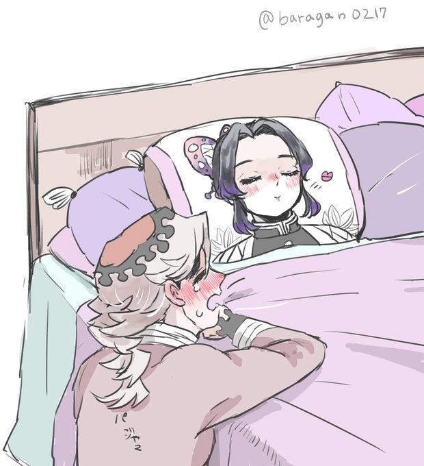 #童しの版深夜の真剣お絵描き60分一本勝負 #童しの お題「枕」「葛藤」 しのぶちゃんのキス顔「枕」を作った童磨くん🌈 作ったものの…大事すぎて使えない!でも使いたいと葛藤し泣いちゃう童磨くん🥳