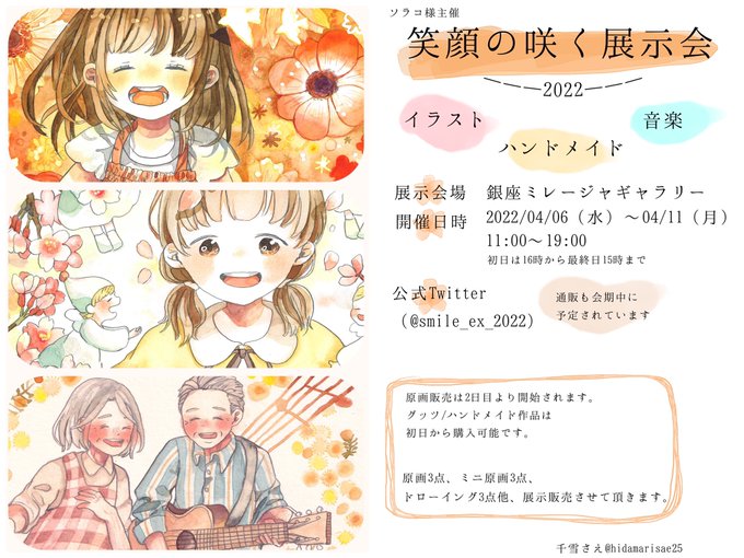 🌸展示参加のお知らせ🌸 こちらの #笑顔の咲く展示会2022 に 参加させて頂きます。 原画3点と、ミニ原画やドローイングなど展示販売させて頂きます☺️ イラスト本もこちらから販売させて頂きます…! 感染対策をしっかり行った上で 私も観に行く予定です…! どうぞ宜しくお願い致します😊 twitter.com/smile_ex_2022/…
