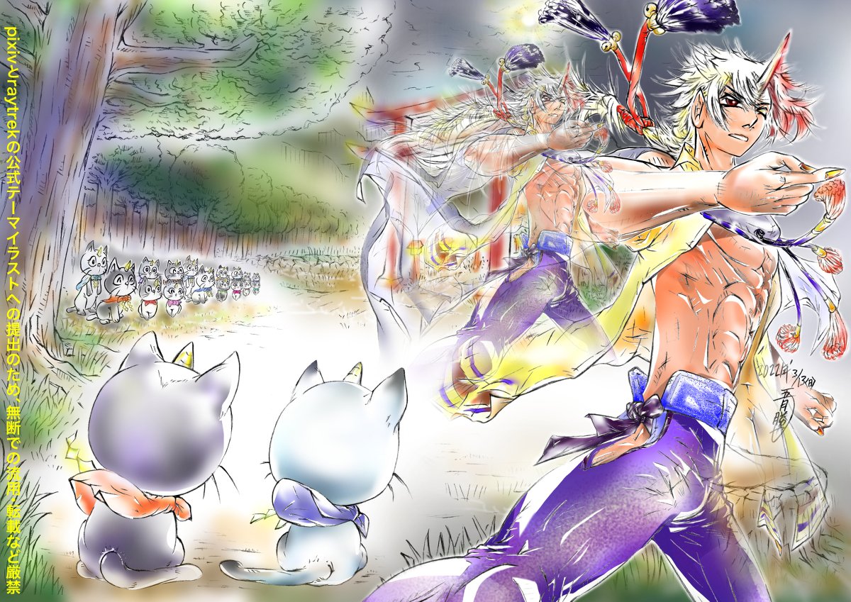 👹 でこパシーでピカッってる鬼猫陣と贈る鬼、ありがと、だろ? #第3回raytrekイラコン闇の魔法使い #ファンタジー #鬼 #Twitter #ネコ #魔法使い #pixiv今日のお題 #異世界 #筋肉 #キャラクター pixiv.net/artworks/97063…