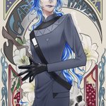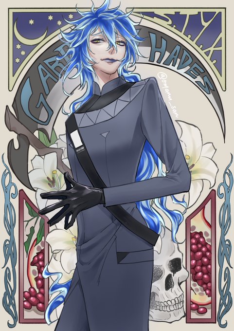 #第3回twstミュシャ企画 twstミュシャ企画にイデア氏で参加させていただきました🙌✨背景の文字隠れてるけど『冥府の番人』になってます(英語苦手マン) ↑のタグから皆さんの素敵なミュシャ風イラストをご覧ください💕もはや美術館~! #twstファンアート #ツイステファンアート