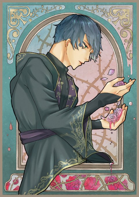 #第3回twstミュシャ企画 セベクで参加させていただきました! 🌿オリーブの花言葉は知恵と平和 🌹サルビアの花言葉は知恵と燃ゆる思いと家族愛 本を愛し、妖精と人間の架け橋となるセベクに平和を願って🕊 #twstファンアート