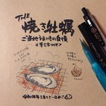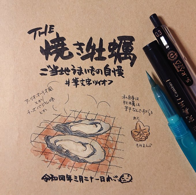 #筆文字ツイオフ お題 : ご当地うまいもの自慢 やっぱり「焼き牡蠣」は焼きたて頂くと美味しいですね~😋かき小屋とかで炭火焼きしたのは本当にオススメです おまけに「もみまん」忘れずに #ちょこっとイラスト #水彩 #アナログイラスト twitter.com/fude_twioff/st…