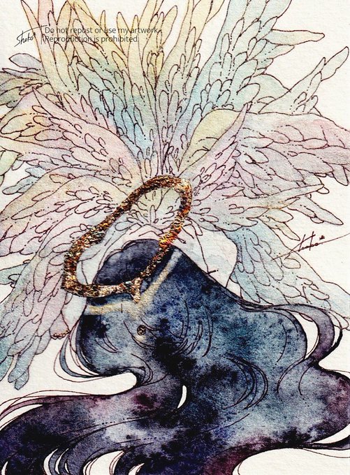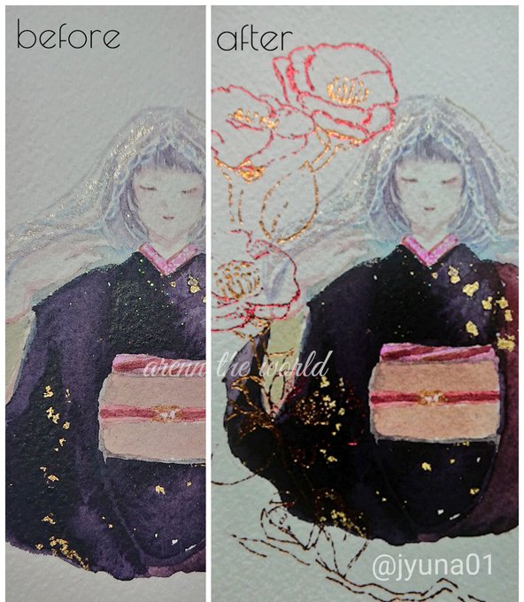 #メタリックデコペン イラストの上に カラー箔のせてみました! 思ったよりキレイにできました✨ #箔 #イラスト #illustration #アクリル絵の具 #水彩 #金箔 twitter.com/jyuna01/stat…