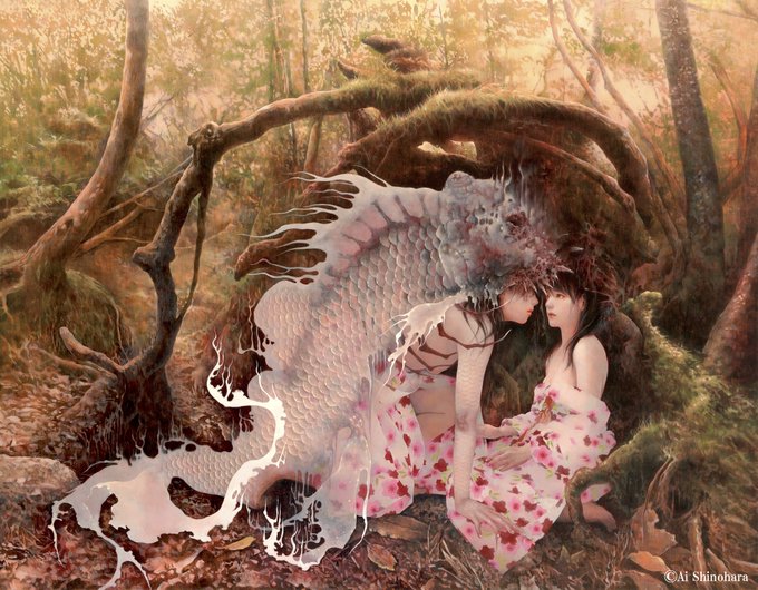 「In the Forest(森の中)」2016 Oil on cotton cloth and panel 91.0×116.7cm 篠原自身が故郷・鹿児島、屋久島の森の中を一人で散策した時の、霊的な体験をもとに描いた作品です。 #aishinohara #oilpainting #art #artwork #篠原愛 #油彩 #油絵