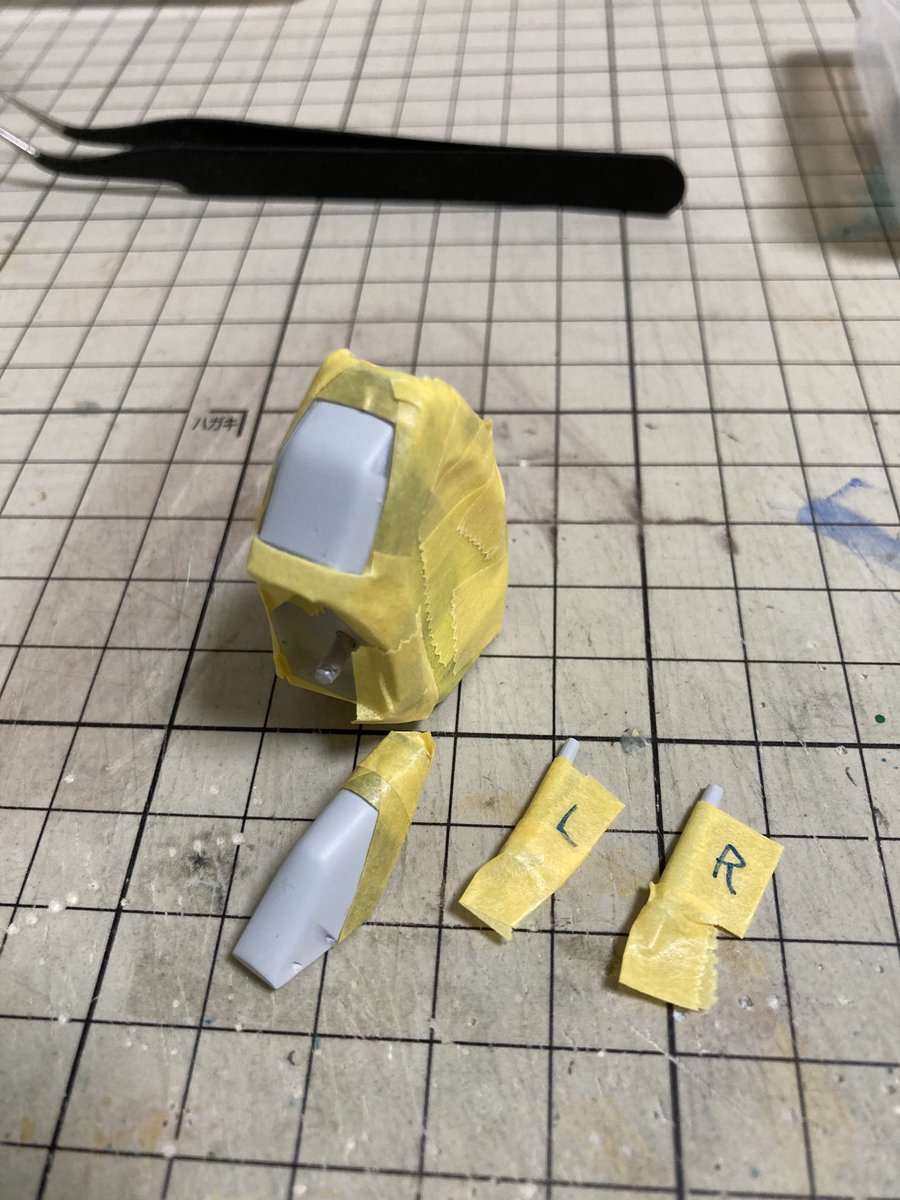 塗装1回目 カラリングのイメージはガンダムのロールアウトカラー 一旦組んで色味チェック 濃度のバラつき発見 次回フォローせねば 次回に向けてバラしてマスキング。 #クリエイターズワン #パトレイバー模型部 #篠原重工八王子工場