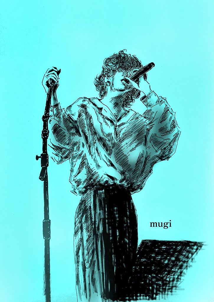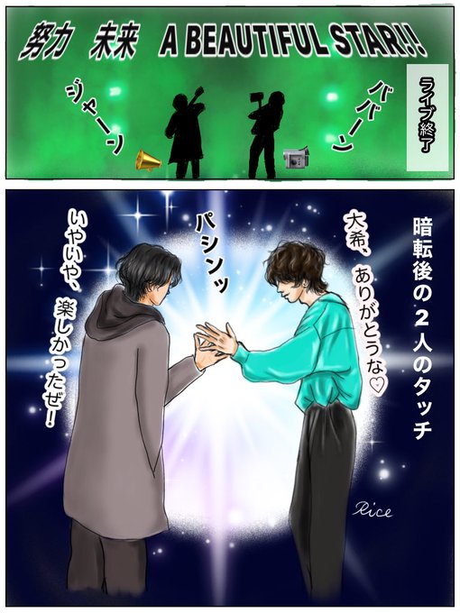 対談で、ライブにて #KICKBACK を二人で歌った後、ハイタッチしたけど暗転後だった、と話されていたのでその場面描きました😊 M V撮影時に2人でタッチしていたのでそこを参考に🙏 いよいよ明日✨ #米津玄師 #米津玄師2022TOUR変身 #イラスト #ibisPaintX