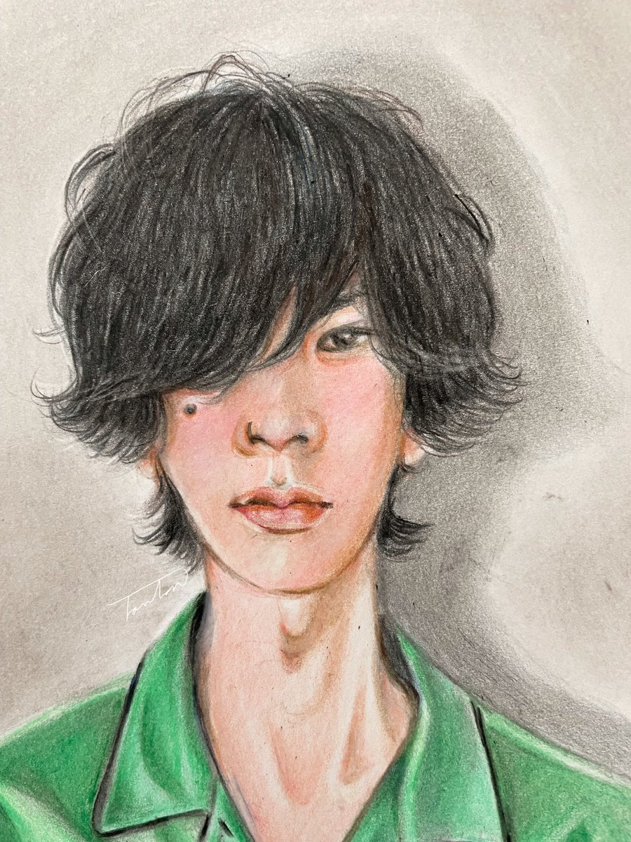 GINZAの緑シャツの米津さんを描きました この写真を見るたびに再起不能にさせられます💚 シャツの艶感がなかなか上手くいきませんでしたが、せっかくなのでポストさせてもらいます🙏 #米津玄師イラスト #米津玄師xGINZA #色鉛筆画