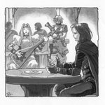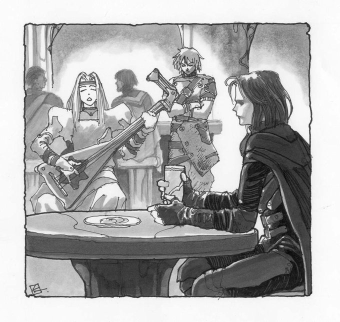 もう一枚、酒場のシーンで空間表現のお話をしてみましょう。 手前の人物はペン入れをしていますが、奥の人物は鉛筆の輪郭線のみです。こうして酒場の奥行きを表現するわけです。 #illustration #イラスト #HitoshiYoneda #米田仁士 #青の聖騎士伝説