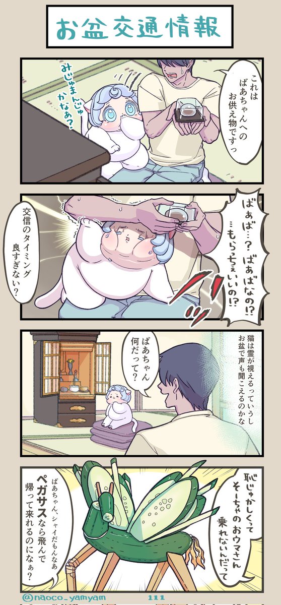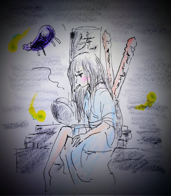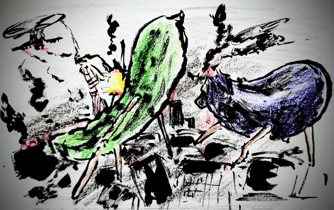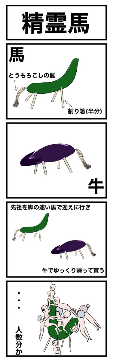 成仏組が帰っちまうと蝉も少し静かになるねえ…あたし?あたしはあの馬に乗れないんだよね… #イラスト #絵描きさんと繋がりたい #お盆 #蝉 #成仏 #精霊馬 #しばらくはこっちにいるしかないねえ