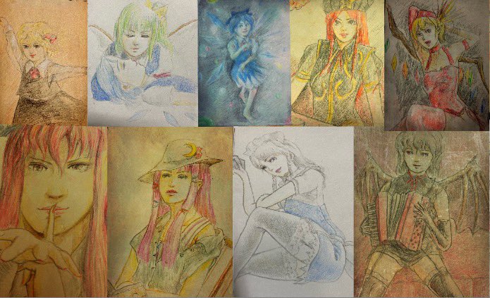#2021年の絵を振り返る この一年だけでもだいぶ貯まりましたね 個人的キャラソートでクリアしている所もあればもう少しな所も ひとまず #紅魔郷 はクリアしたので順にいくと妖々夢ですね、あと少しでクリアです #アナログ絵 での自分のタッチで #東方オールキャラコンプ の道のりは長いです😓