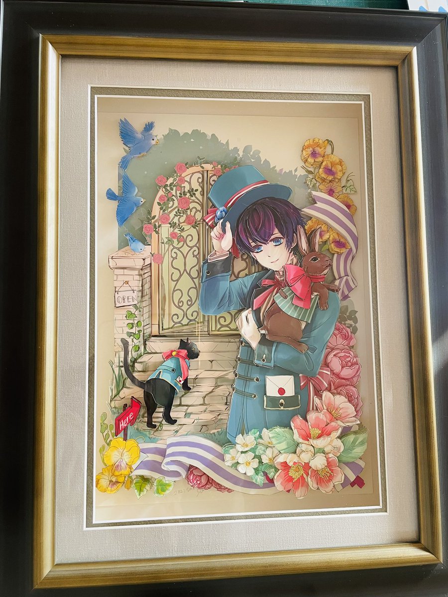 #稲沢イラストアート展 の代表である #紗蔵蒼 さんの #シャドーボックス は本当に手間がかかってすごい!! 特に葉っぱの一枚一枚が曲線になっていたりしてビックリ! そして、展示イラストの他に缶バッジのガチャも楽しませてもらいました♪