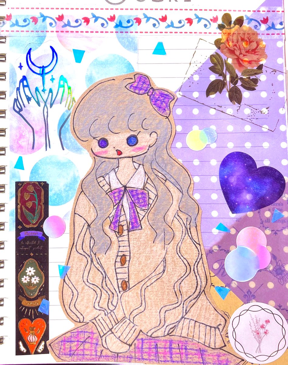 七味ちゃん(@sitimi_karasi7 )とイラスト交換コラージュ🫶 お題を揃えてイラストを描きました🙌 イラストもコラージュも個性が出て楽しい♬ 七味ちゃん、イラスト上手すぎる😆🙏 #イラストコラージュ #イラスト #イラスト交換コラージュ #紙モノ #シール #マステ