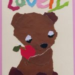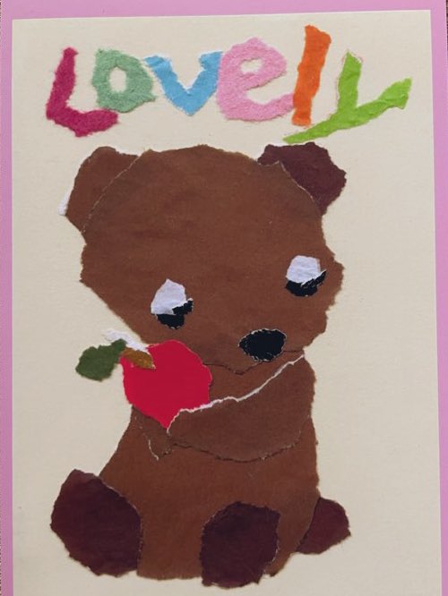 ちぎり絵で作った作品です。 「Lovely 」 Chigiri-eh(Collage of Finger-torn colored papers) 「Lovely」 #イラスト #イラスト好きさんと繋がりたい #熊 #Illustrations #paperart #bear #紙作品 #りんご