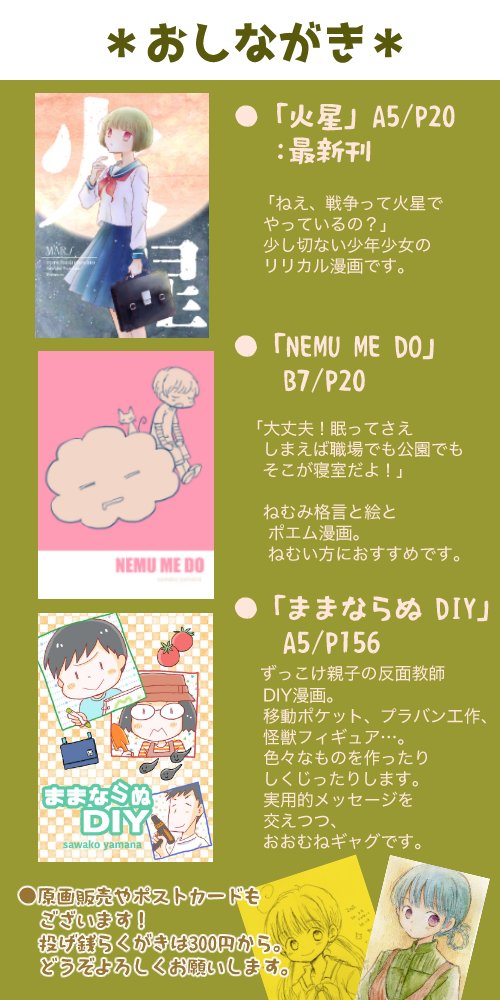 #紙本祭_お品書き です。15時に水彩イラストが加わります。絶賛出品作業中でございます。「NEMU ME DO」は本日はサイン入りになります。 yamanasawako.booth.pm/item_lists/rKQ… #紙本祭