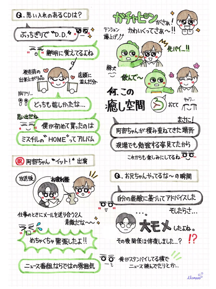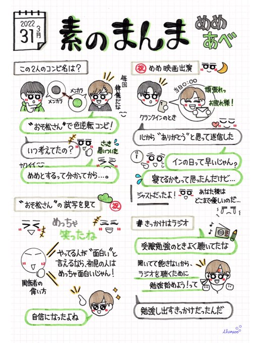 めめあべ素のまんまをまとめました✏️ 単独でのお仕事の日にメールを送り合う2人、素敵な関係性だ…😌そんな優しい世界を掻っ攫っていくガチャピンと兄者。 #素のまんま #めめあべ #おそ松さんで色逆転コンビ