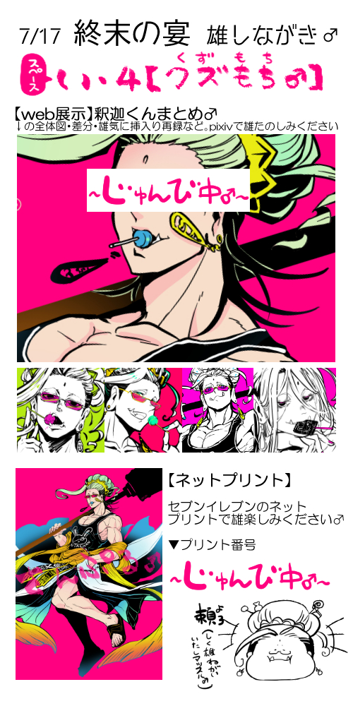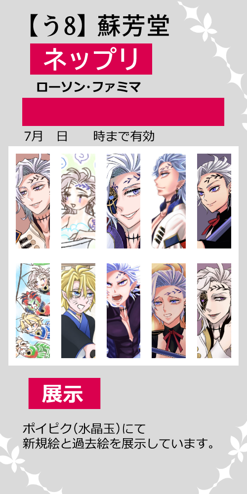 ■お知らせ■ 7/17【#終末の宴】参加させていただきます! 「う8 蘇芳堂」 ・ネップリ11枚(番号は当日にお知らせ) ・展示はポイピクにて新規絵と過去絵を合わせて30枚くらいあります。 当日はよろしくお願いします! #終ワルwebオンリー