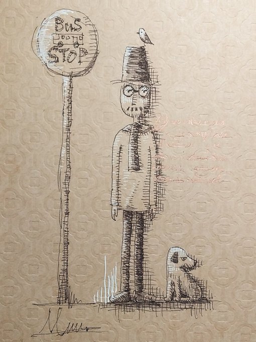 バス待ってます🚌 わんこも待ってるね。 オジサン画家Muuでした〜 • • Muuアート作品はこちら↓ muumuuart.com/415 夢追転身画家Muuプロフィール↓ muumuuart.com/profile-2/ #絵描きさんと繋がりたい #絵かきの輪 #犬猫好きさんと繋がりたい #イラスト #art #みんなで楽しむTwitter展覧会