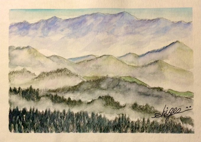 〜紀伊の山々〜 今朝は黒の色鉛筆と透明水彩絵の具を使って、いつも見慣れた紀伊の山々を描いてみました。雨上がりの靄が立つ山々。その連なりに時を忘れて見入ってしまいます。 #透明水彩画 #風景画 #紀伊の山々 #靄が立つ山並み #絵を描いている人と繋がりたい #絵が好きな人と繋がりたい