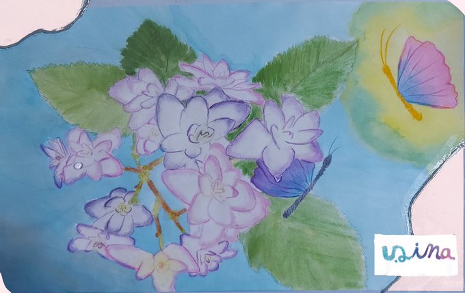 #制作過程 鉛筆✏️→ #色鉛筆 → #パステル → #水彩 → ボケた所を引き締める為に #色鉛筆 →立体的にしたくて #ジェル を使いました👏✨ 次は何描こう? 静から動に変わるのが好きだからなぁ~🤔✨ #絵画ずきさんと繋がりたい #絵描きさんと繋がりたい #絵を描くのって楽しい #紫陽花 #蝶