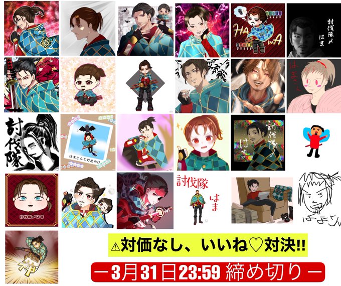 🗒✎*🗒✎*🗒✎*🗒✎*🗒✎*🗒✎* 討伐隊〆はまさん イラストコンテスト~✍⋆* いいね❤️対決‼︎‼︎ ⚠️ 3月31日 23:59〆 🗒✎*🗒✎*🗒✎*🗒✎*🗒✎*🗒✎* 引用元に 沢山のご応募お待ちしております☺️ #絵師さん #イラストコンテスト twitter.com/kadukisama/s…