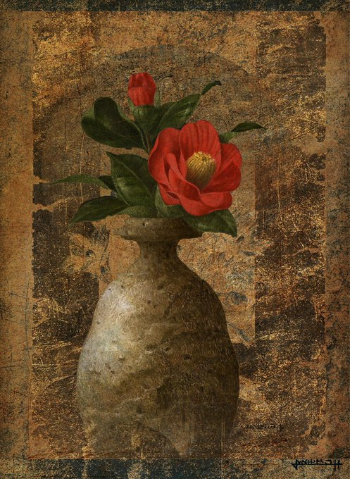 ほだか作「信楽焼の椿」(油彩画) おはようございます‼ 最高の土曜日になりますように(^^)/ #いいねで気になった人フォローする #夏の創作クラスタフォロー祭り #絵描きさんと繋がりたい #油絵 #イラスト王国 #絵師さん #ギャラリー #拡散希望 #RTで私を有名にしてください #芸術の輪 #芸術同盟