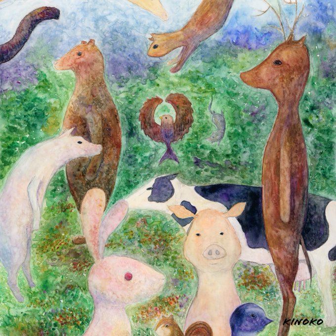 Gallery IYN様企画の2023年2月3日からのアニマルイラスト展に出展します。 友人から背景は緑にすればとの助言で草花生やしました。 #IYN #IYN企画に参加します #アニマルイラスト #animalart #動物イラスト #illust #illustration #イラスト #絵本風イラスト #art #アート #watercolor #水彩