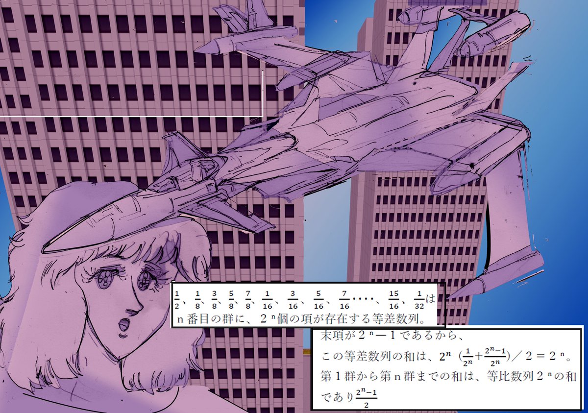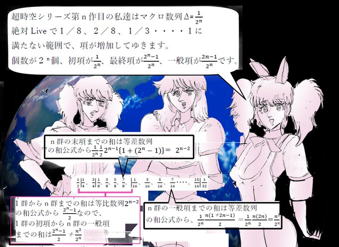 #みんなで楽しむTwitter展覧会 #ArtistOnTwitter #WorldA_RT #マクロスΔ #マクロスデルタ #絶対Live 超時空シリーズ、マクロ数列Δ=1/2^n! 2^n個の項をもつ群の総和は、2^n(1+2^n―1)の計算により、2^nになります。なので、最初の群からの総和は、等比数列の和になります。 twitter.com/deadlinear2011…