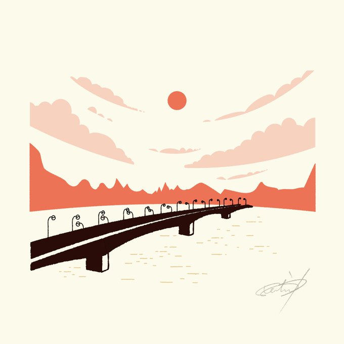絶景というは樽肴ありてこそ(茶やコーヒーも可) #景色 #絶景 #夕日 #橋 #おしゃれイラスト #イラスト #絵描きさんと繋がりたい #イラスト好きな人と繋がりたい #イラストレーターさんと繋がりたい #レトロモダン