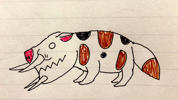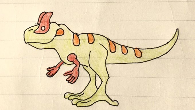ケロサウルスです。 カエルと同じく両生類でどんな垂直な壁でも登れたけど、そもそもこの時代に大きな壁が少なく需要が無くなったことから絶滅した。 #イラスト好きな人と繋がりたい #絵描きさんと繋がりたい #オリキャラ #恐竜 #カエル #絶滅