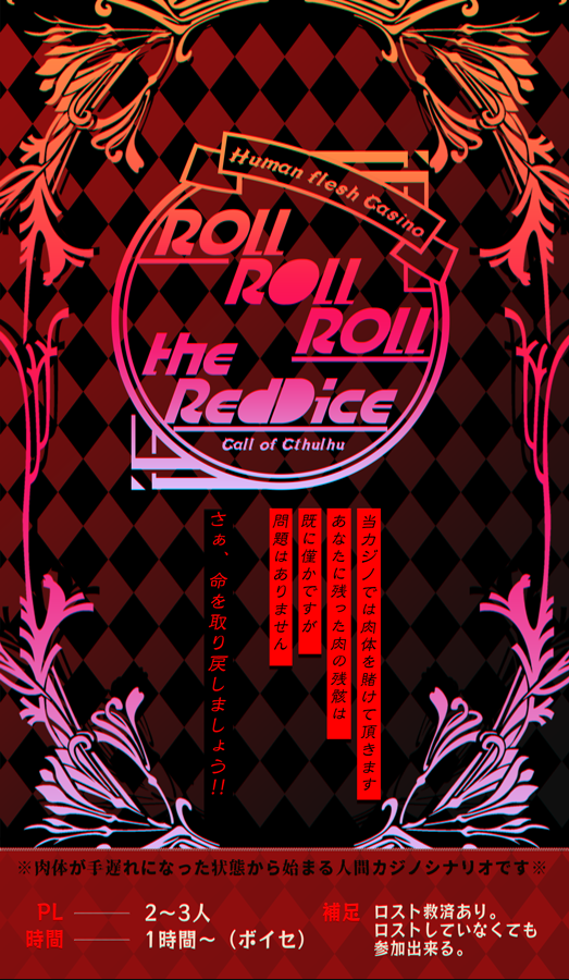 【公開しました!】 CoCシナリオ「Roll Roll Roll the RedDice」 肉体が手遅れになった人が行き着く、人間カジノシナリオです。短時間でわいわいダイスゲーム(オリジナルルール)が遊べます。 #継続シナリオ祭 shiroba.booth.pm/items/3591957