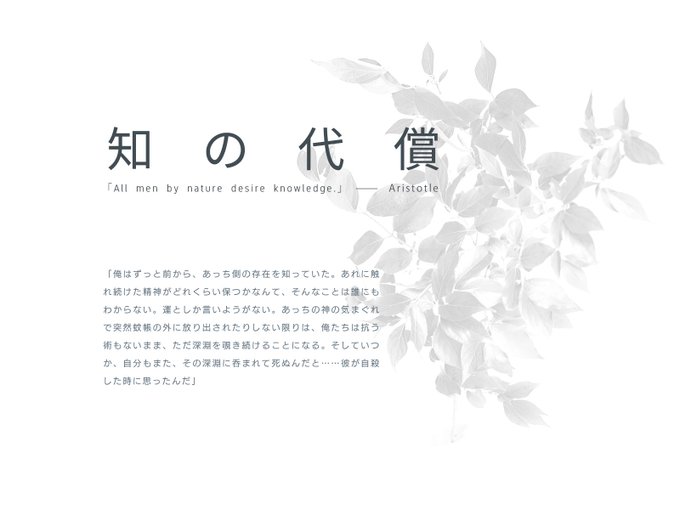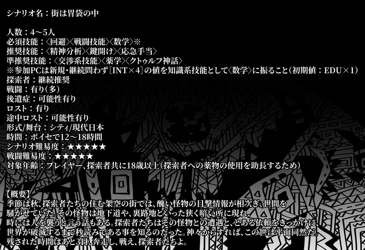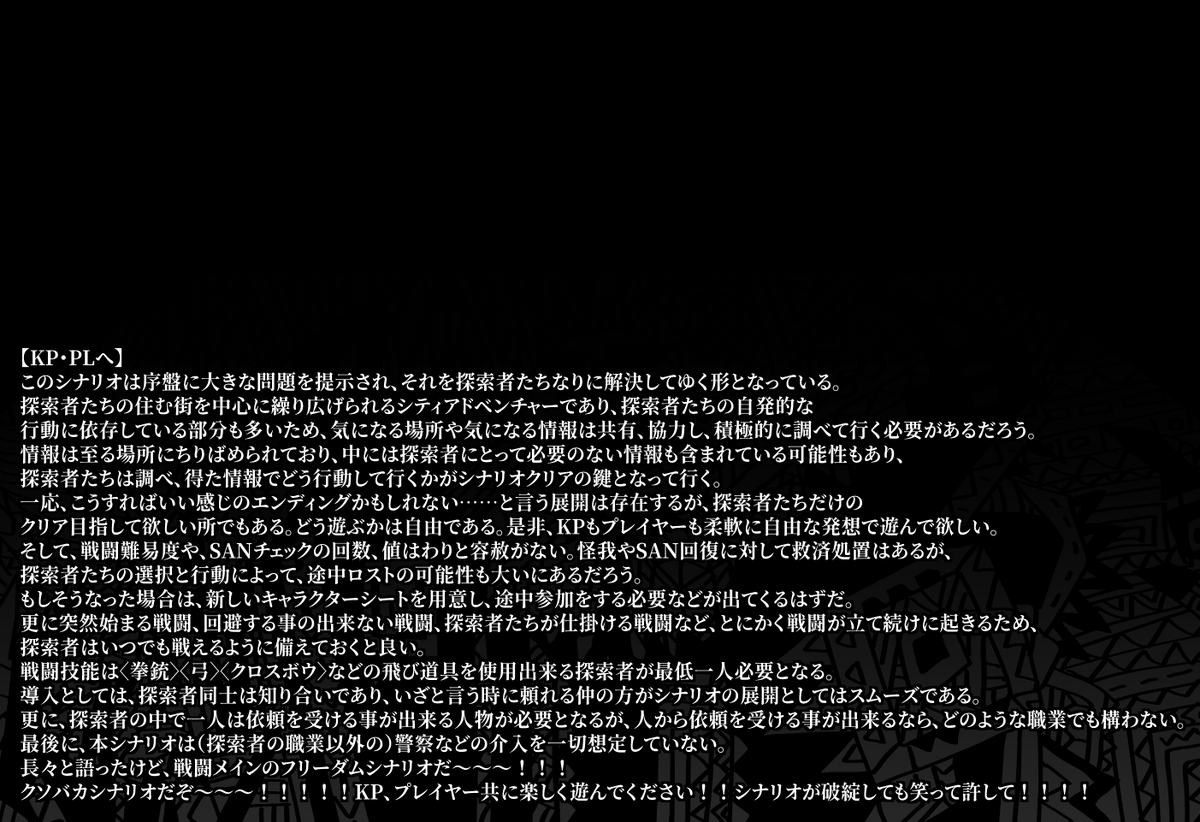 COC『門、或いは翹首されるもののテーブル』 不定 or 神話技能持ち探索者推奨。退院日の朝から始まる不条理2PL。 進行上全裸になります。エロではない性的不快、血肉や痛覚とは別のグロテスク表現を多く含みます。 #継続シナリオ祭 suien.booth.pm/items/3309251