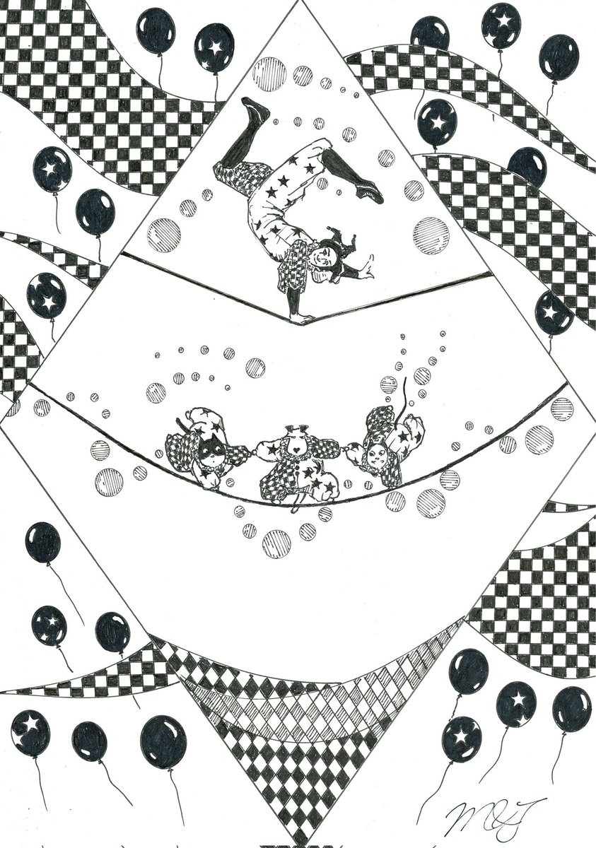 🎪🃏😸😺🐶「《道化師と陽気な仲間たち》の、愉快な綱渡りショーをお楽しみ下さい!💛🎉💛」 by 《道化師と陽気な仲間たち》 #アトリエの系譜S #道化師と陽気な仲間たち #アナログイラスト #モノクローム #オリジナルキャラクター #マンガスタイルイラスト #picturebookillustration #綱渡り