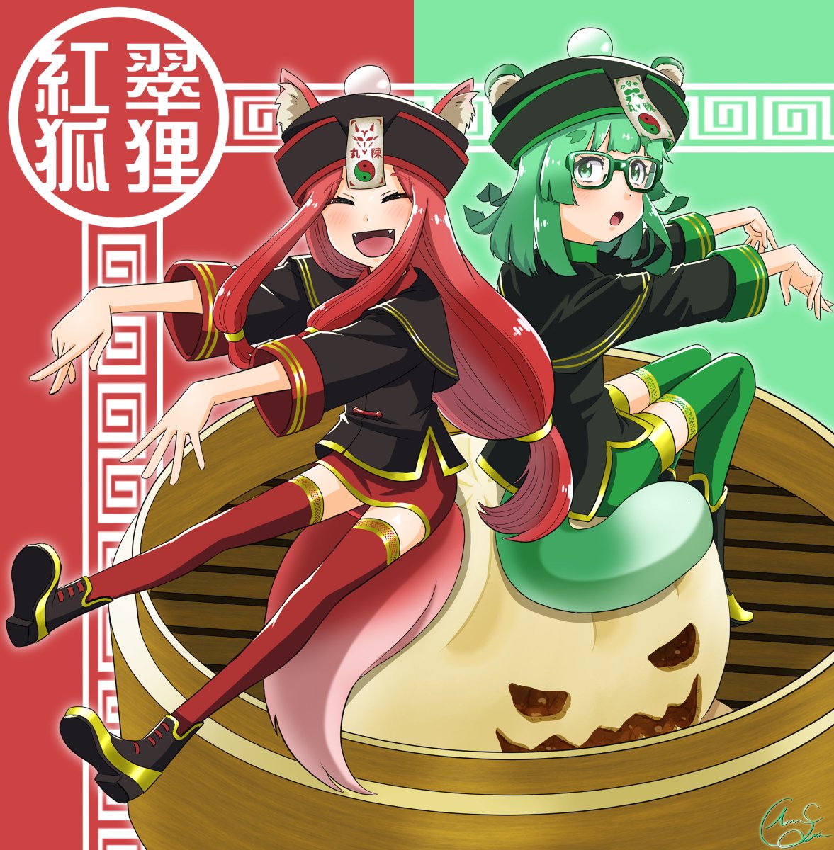 トリック・オア・トリート🦊🦝🎉🎉 ハロウィンはキョンシーコスで 紅いキツネさんと翠のタヌキちゃん うちの子と言うには なかなかスレスレな名前… 某カップ麺の擬人化やね #絵描きさんと繫がりたい #オリキャラ #ハロウィンイラスト展示会2021 #赤いきつね #緑のたぬき