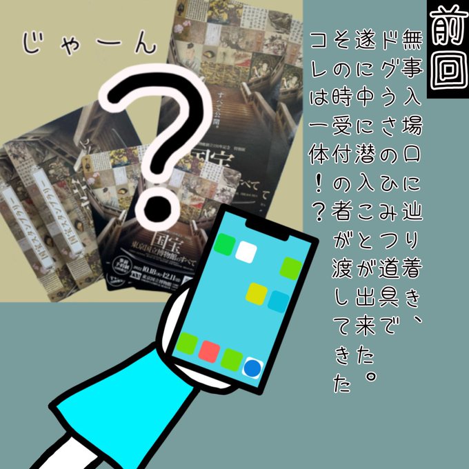 《ドグうさのひみつ道具》 長かった・・・遂に入場! えへへ ドグうさは最近の電子機器も 使いこなせる土偶(うさぎ)だからな! 入場口のお姉さんがくれたこれは 一体!!? #ドグうさ #漫画が読めるハッシュタグ #国宝展 #トーハク #縄文 #縄文好きさんと繋がりたい #4コマ #4コマ漫画