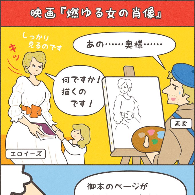 【ネタバレあり】四コマ映画『#燃ゆる女の肖像』 → 4koma-eiga.jp/fourcell2/entr… エロイーズに「描くのです!」って叱られてもう1人の画家がいたのでは、という。 #映画イラスト #イラスト #縦読み漫画 #イラストレーター #CélineSciamma #Portraitdelajeunefilleenfeu