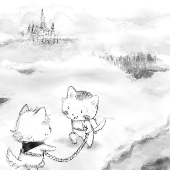 day 26 繋ぐ・connect 雲の上を冒険中。目的の城までもう少しだよ! #inktober2021 #Inktoberday26 #illust #illustration #AdobeFresco #イラスト #ピースにゃ #オリキャラ #繋ぐ #猫