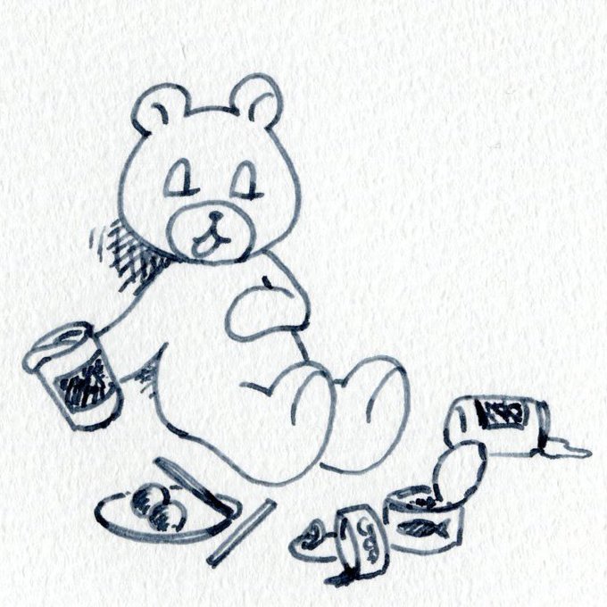本日10月10日は #缶詰の日 と #肉だんごの日 と #ワンカップの日 だそうです(おい体育はどうした!?) #イラスト #ペン画 #inkdrawing #くま #illustration