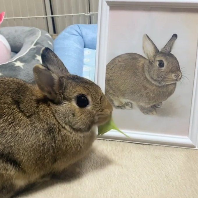 #色鉛筆画 ✏️ オーダー A5 完成‼️✏️ 🐰ラブちゃんに 🥬小松菜🥬あげてみたよ🤣 食べてる❔🤣 🐰 #うさぎ #ネザーランドドワーフ #羊毛ちくちく瞳コレクション #羊毛ちくちく #羊毛ちくちくheartleaf #似顔絵 #肖像画 #絵描きさんと繋がりたい #うさぎのいる暮らし