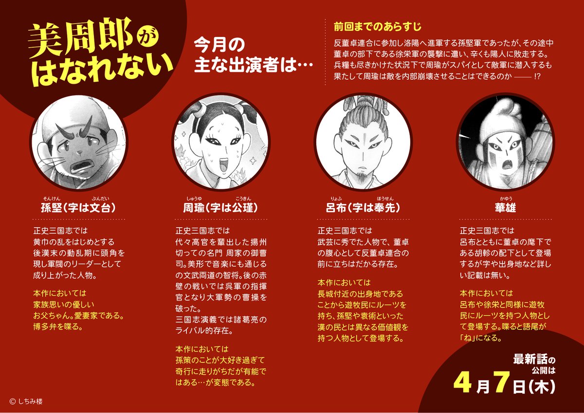 今月の 『美周郎がはなれない』は 12日木曜日のお昼頃更新予定です‼️ 反董卓のスローガンのもと、雒陽へ兵を進める孫堅軍! 果たして董卓を倒すことができるのか⁉️ 前回のお話はこちら💁♀️ matogrosso.jp/serial/kin-ken… #美周郎がはなれない
