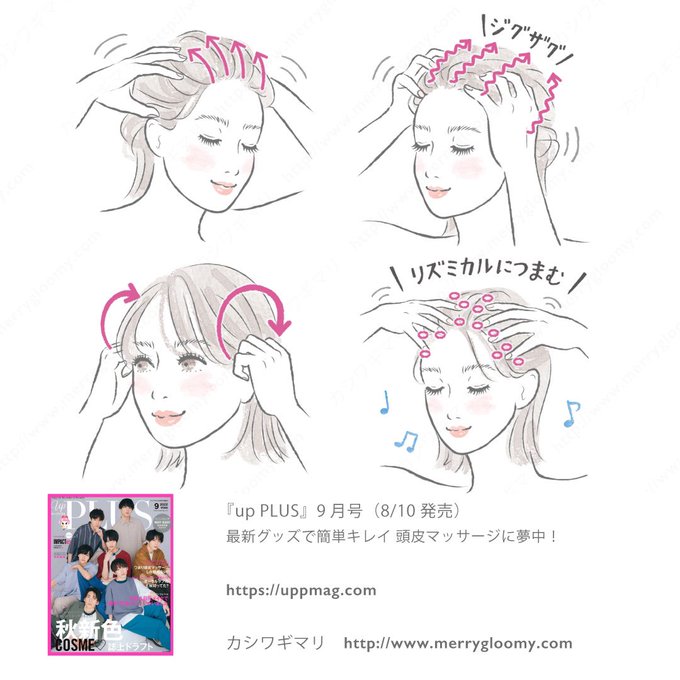 発売中の「アッププラス」9月号の”最新グッズで簡単キレイ 頭皮マッサージに夢中!”という特集でイラストを担当させていただきました☺️ ▼アッププラスオンライン uppmag.com #アッププラスアッププラス #イラスト #美容イラスト