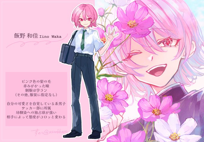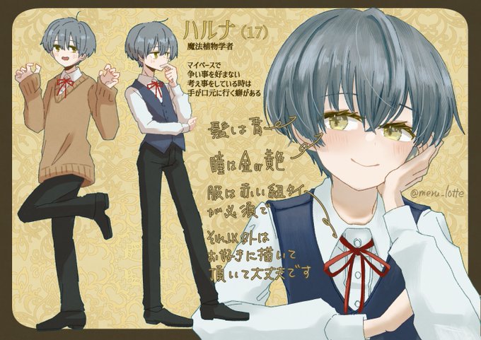 #美少年ワンドロ_うちの子資料 企画、参加させていただきます〜! 💐ハルナ💐 最年少で魔法植物学者になった天才少年。 人見知りで野菜嫌い、時々考え事をしている。 服装は首元の赤いリボン以外は特にこれというのはありません。お好きにアレンジしていただいて大丈夫です。 よろしくお願いします🙌