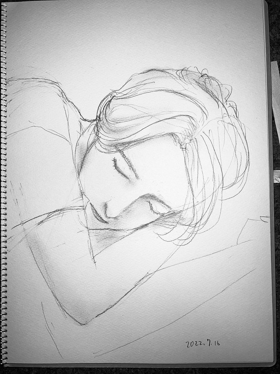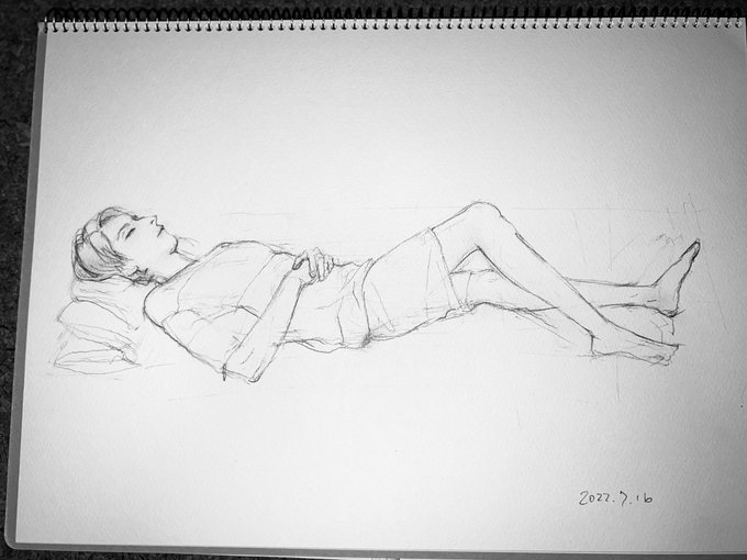 こんばんは⭐️ #美男子スケッチ会 に参加しました🎨 モデルくんはお昼寝男子❤️ レクチャーは寝た時の髪の流れ、足の描き方等。 膝の位置をご指摘頂きました( •̀ •́ゞ 俯き顔全身画よりムズいっ💦2枚ボツ💦 次もがんはるぞー🔥 次回は8/28です🌻 #絵描きさんと繋がりたい #世界絵師 twitter.com/binanshi_sketc…