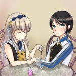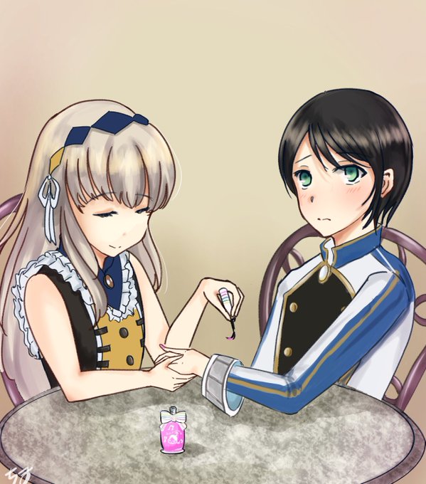みことさんにマニキュアを装備してもらってるくにちゃん。みこくに久しぶりに描いた。 くにちゃんは「こういうのは絶対にお姉さまの方が似合うのに…」とか思ってそう #美談みこと #美談くに #駅メモファンアート