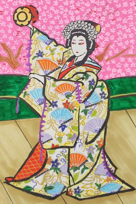 #衣装 『静御前』が鼓を持ち、恋人である義経の後を追います✨衣装は白地の打掛に、扇・季節の草花がデザインされています😊 #イラスト #絵描きさんと繋がりたい #絵師さんと繋がりたい #冬の創作クラスタフォロー祭り #みんなで楽しむTwitter展覧会 #Twitter交流会会場 #art #義経千本桜